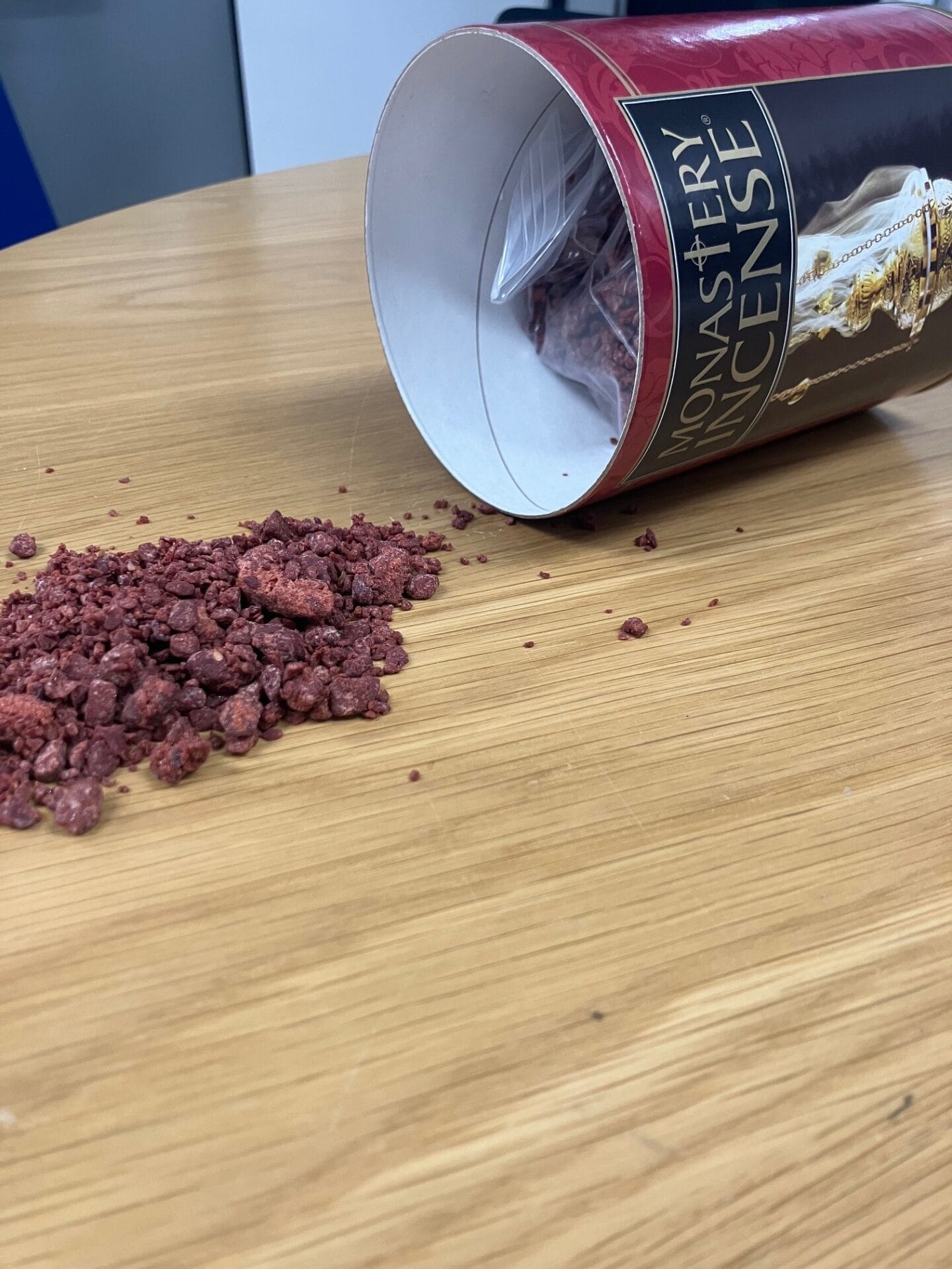 Natural frankincense and other incense gums are ground to a powder, mixed with a secret blend of perfumes, and formed into small pebbles.