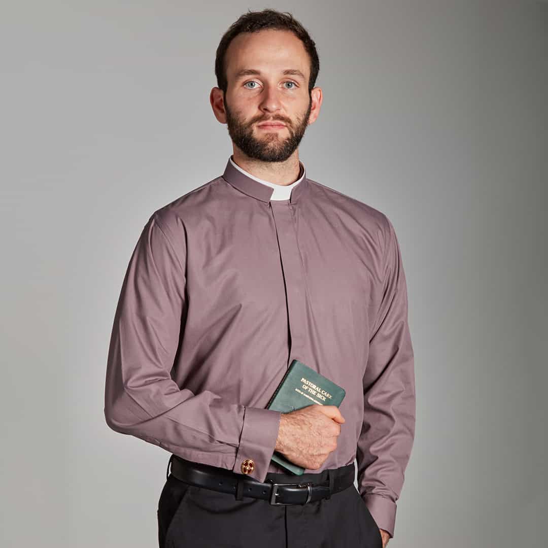 Clergy Shirt with a tonsure collar, long sleeves and double cuffs. Made by Hammond and Harper of London.