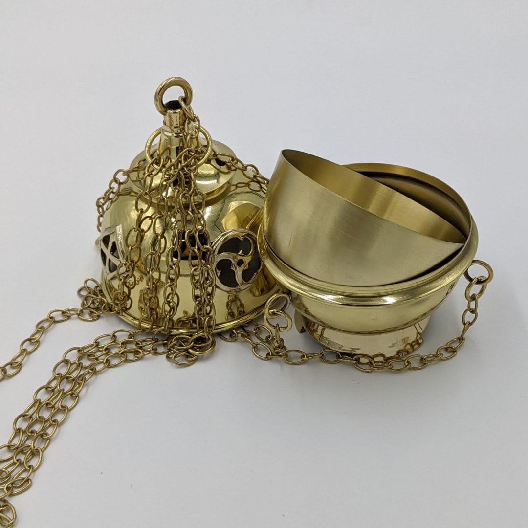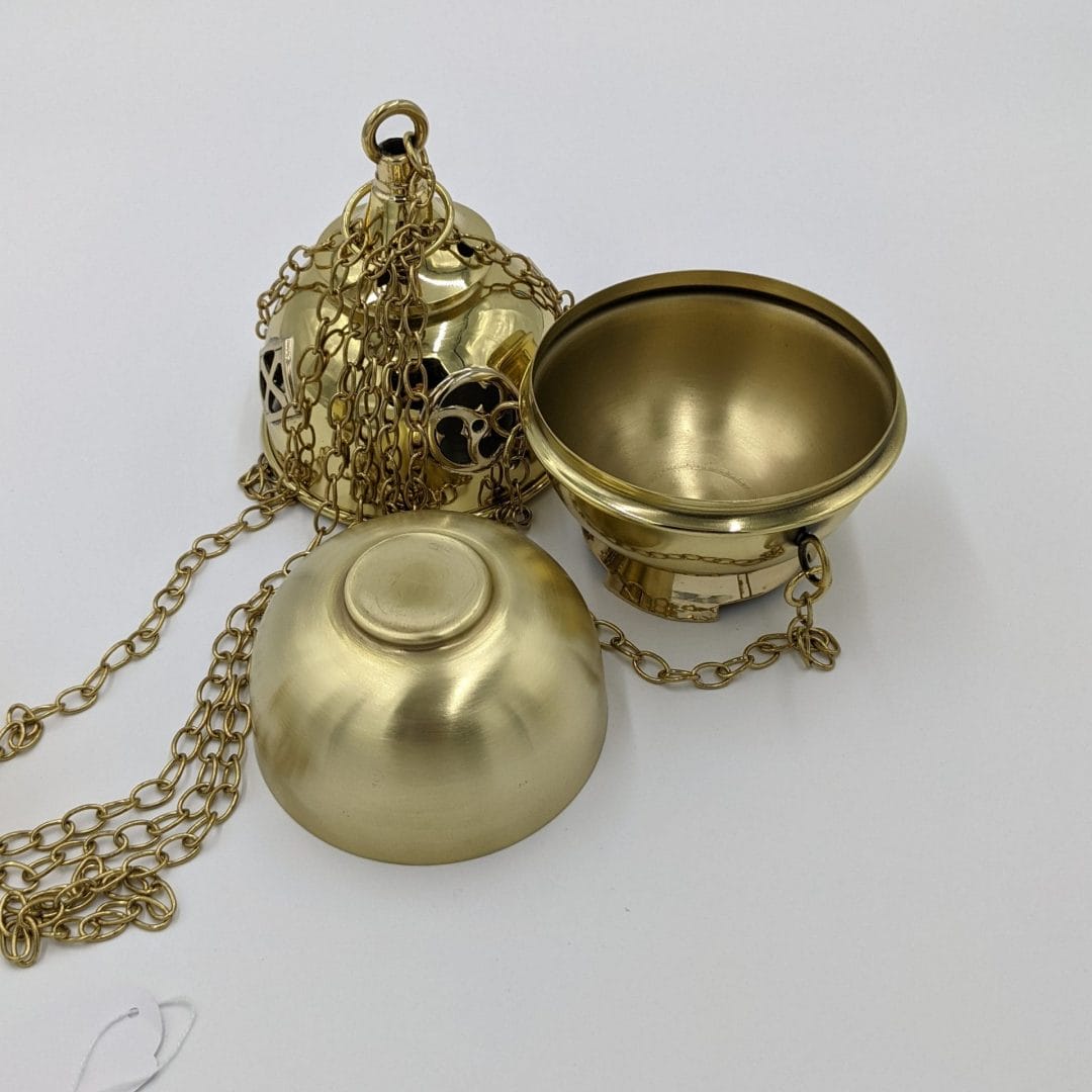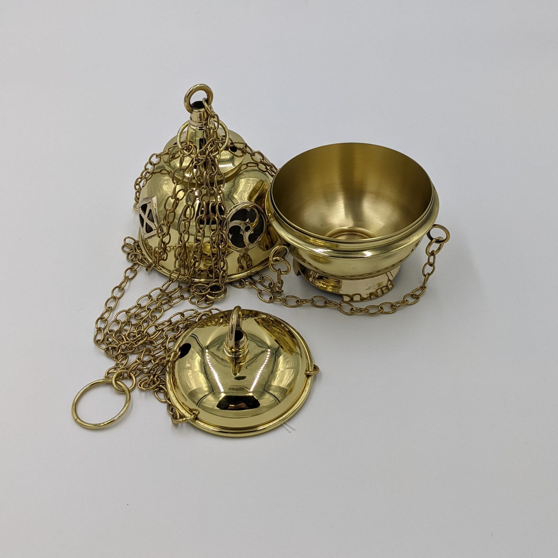 Thurible, in a four chain design with square and round castings. This Large thurible is made in the United Kingdom, of cast and polished brass. Removable bowl for ease of cleaning. It stands at 20cm overall height, the bowl is 10cm across. The base is three footed to ensure it stays stead if placed on an uneven surface.