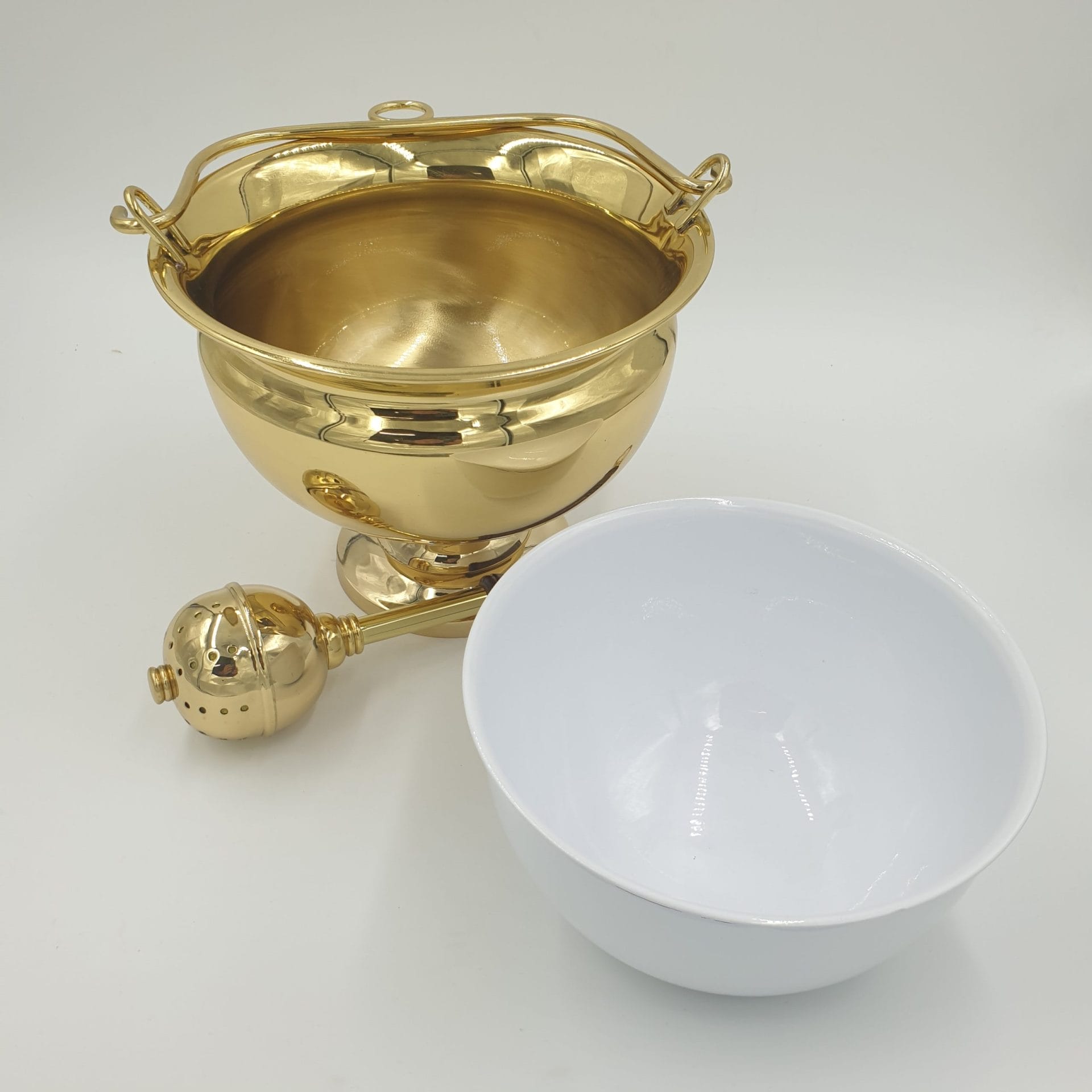 Large Brass Aspergers Bucket and Sprinkler- Height 18cm Diameter of the Rim/mouth 22cm. Sprinkler with wooded handle-Length 30cm. Removable white enamel inner water receptacle.