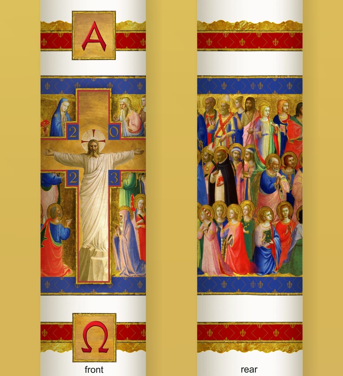This beautiful design is prepared by a graphic designer here in NSW, with striking clarity and colour. The logistics involved are considerable, and we ask that you order as early as possible. We cannot carry each option in stock, so these are made to order. Please allow up to 4 weeks. The Fra Angelico design wraps around the entire candle.