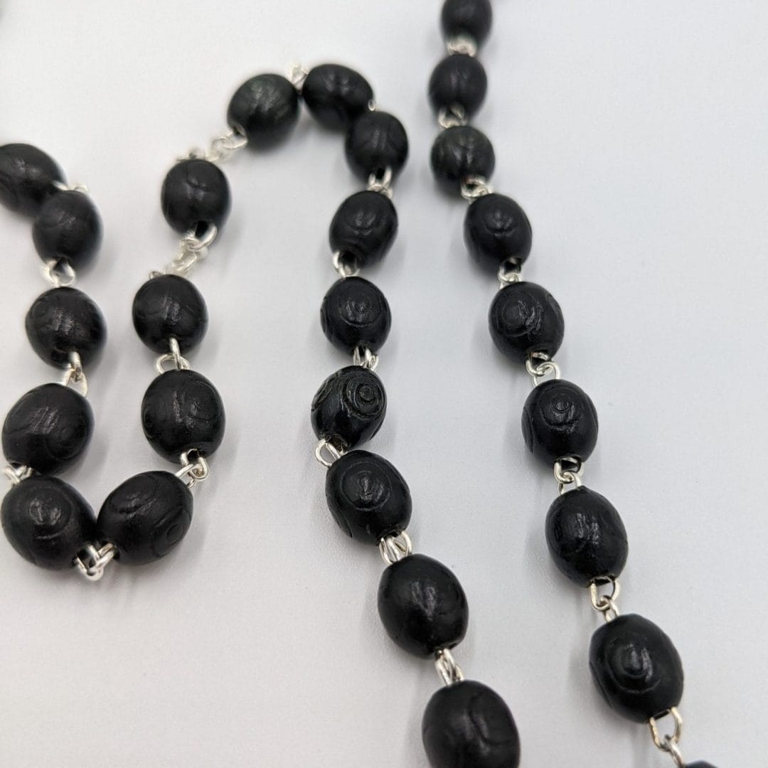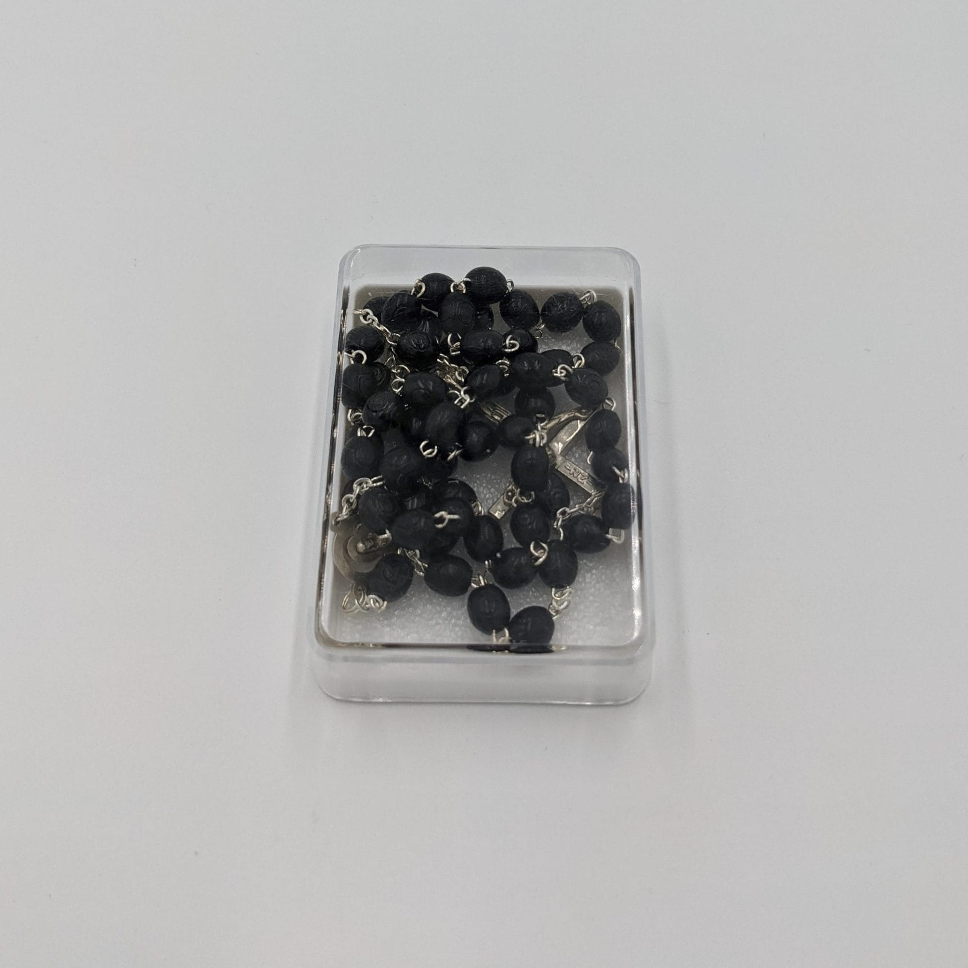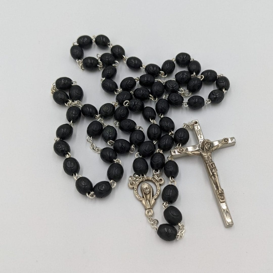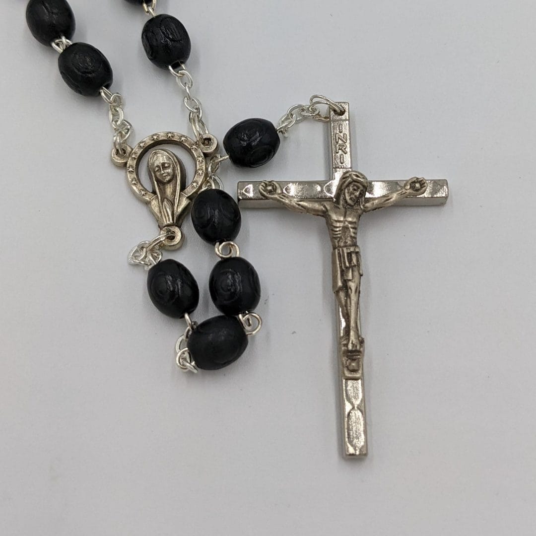 Rosary Beads circular detail on black beads, made in Italy. 5mm beads; overall length 53cm; simple metal crucifix, 50mm); Our Lady of the Rosary centre piece Sacred Heart on rear; oval block wood beads