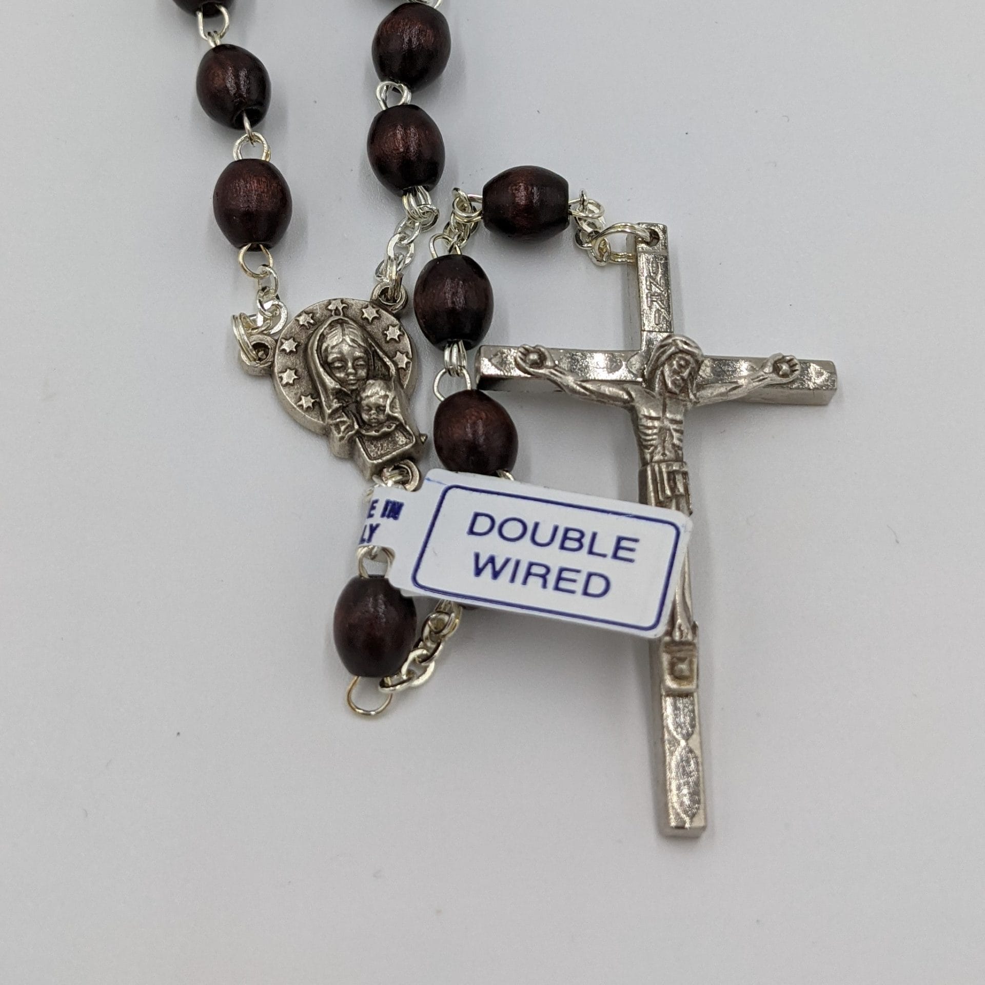 Rosary Beads circular detail on brown wooden beads, made in Italy. 5mm beads; overall length 53cm; simple metal crucifix, 50mm); Our Lady of the Rosary centre piece Sacred Heart on rear; round wooden beads