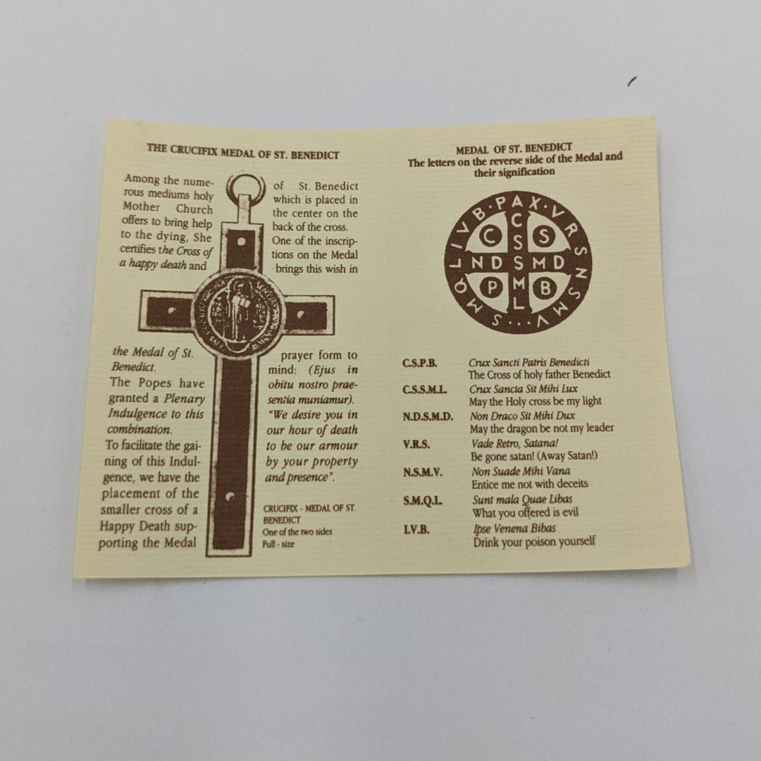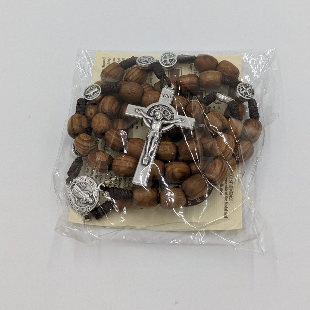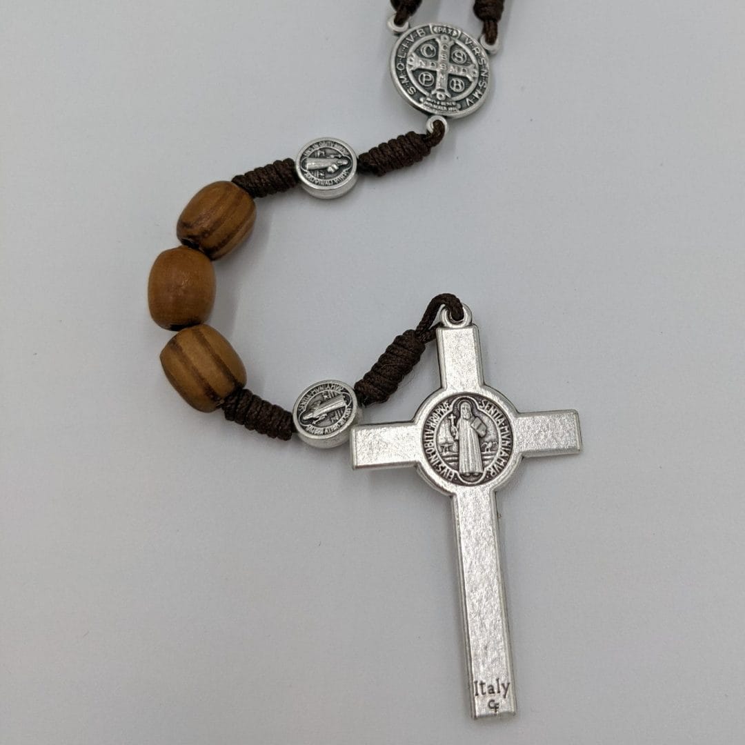 St Benedict rosary beads, made in Italy; Brown beads; 10 mm bead width; 52 cm overall length; St Benedict Crucifix 50 mm long; St Benedict medal centrepiece; olive wood beads; nylon cord stringing, with small st Benedict medals as decade markers.
