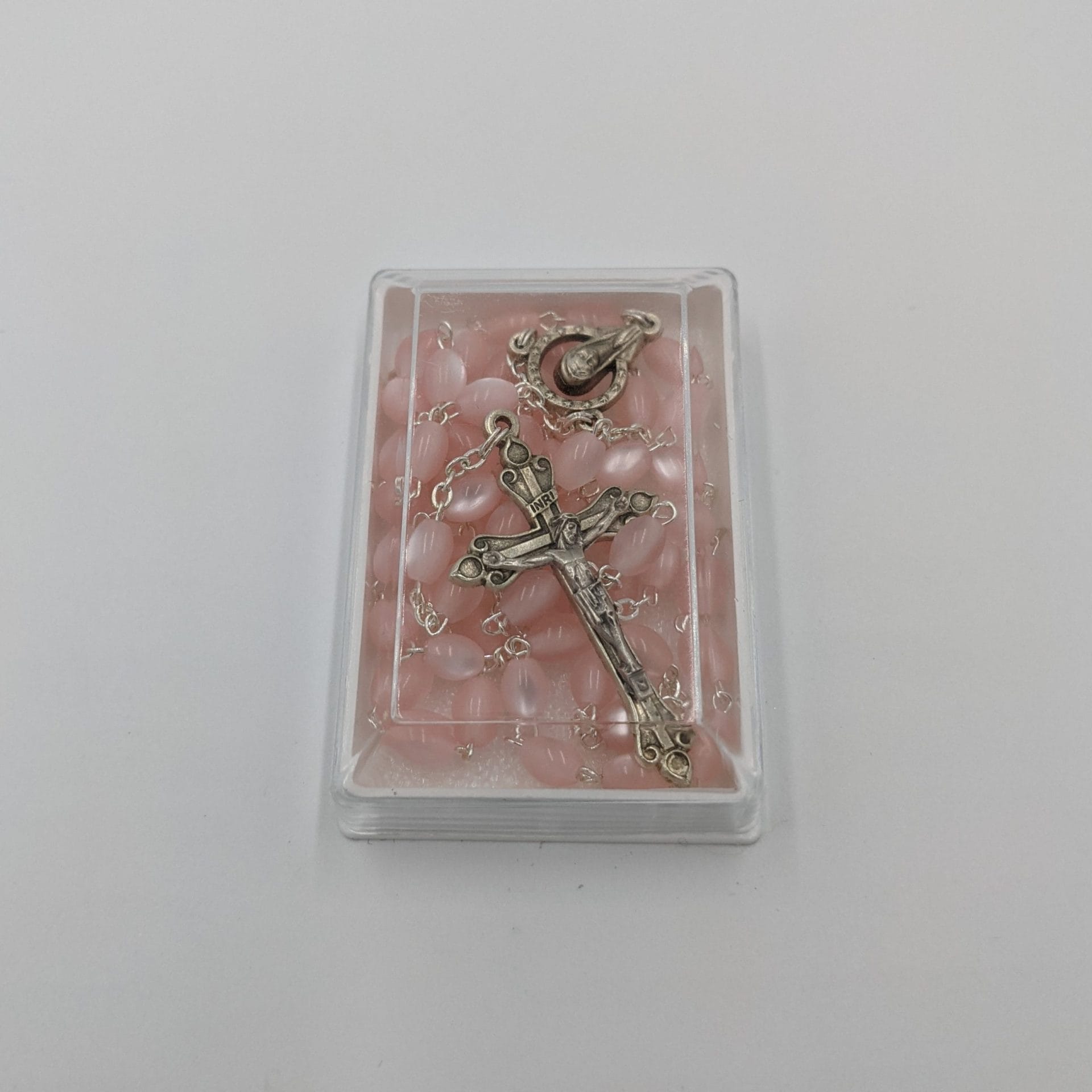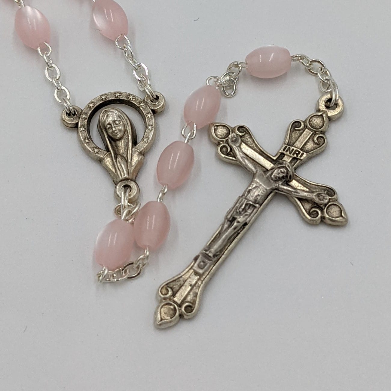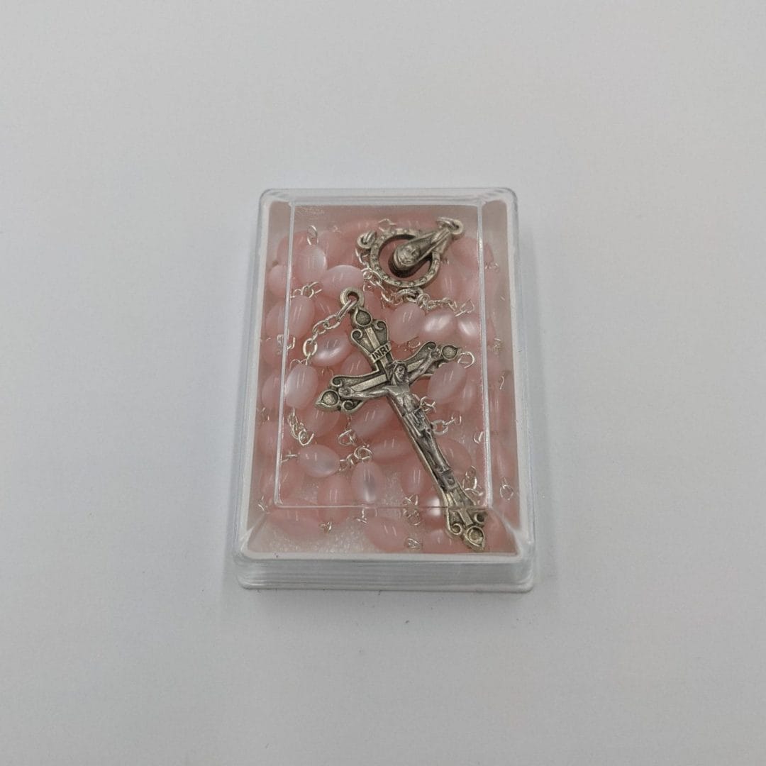Rosary beads pearl pink made in Italy. 5mm beads; 52cm overall length; stylised fluer de lis crucifix 45mm; centrepiece is of Our Lady of Grace; pink beads