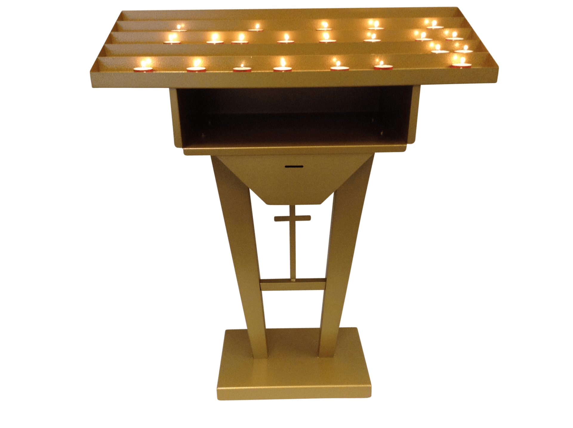 Designed for use with tea light candles, with 6 levels at 2.5cm spacing. Height 95cm, width 80cm, depth 35 cm. Made in Italy of gold-painted steel.